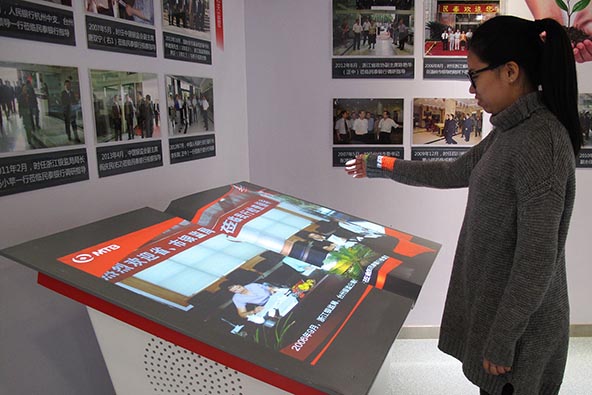 互動滑軌屏又稱滑軌電視,它將相對枯燥的文字信息展示在視頻上,減輕了解說員滿場解說的負擔,參觀者能夠一目了然的了解產品信息。